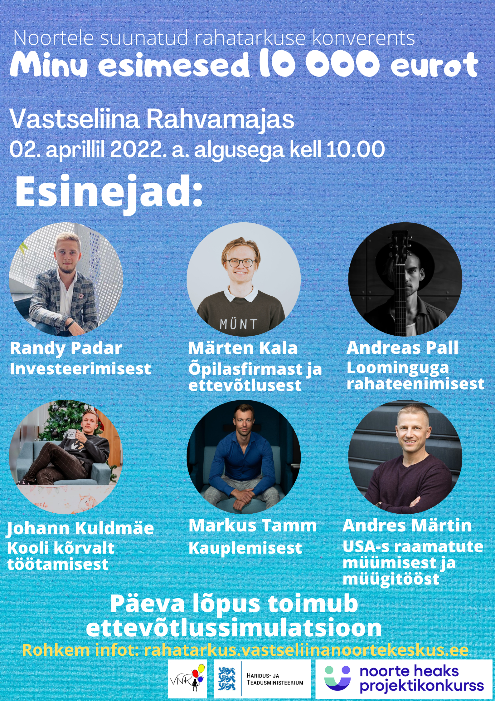 02. aprillil toimus Vastseliinas rahatarkuse konverents “Minu esimesed 10 000 eurot”. Vaata, mis seal toimus ning kes seal esinesid. ESINEJAD AJAKAVA MATERJALID